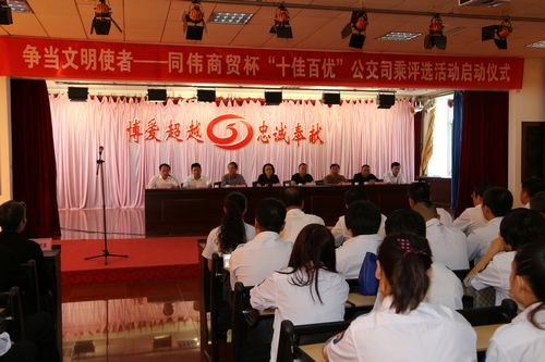 為推進唐山市精神文明建設,培育文明禮讓和諧之風,不斷提升公交服務質(zhì)量,由唐山市精神文明建設委員會辦公室、市城管局、市交通運輸局、唐山廣播電視臺、市公共交通總公司、同偉商貿(mào)有限公司聯(lián)合舉辦的“爭當文明使者—同偉商貿(mào)杯·十佳百優(yōu)公交司乘評選”活動于9月18日正式拉開帷幕。市委宣傳部副部長、市文明辦主任李麗,市委宣傳部副部長、唐山廣播電視臺臺長王力,市城管局副調(diào)研員張志棟,市交通運輸局城客處處長楊文強,總公司總經(jīng)理趙俊良、黨委書記夏保良和部分班子成員,同偉商貿(mào)有限公司副總經(jīng)理盧志敏出席啟動儀式,司乘代表、乘客代表和新聞媒體代表共計300余人參加了啟動儀式。